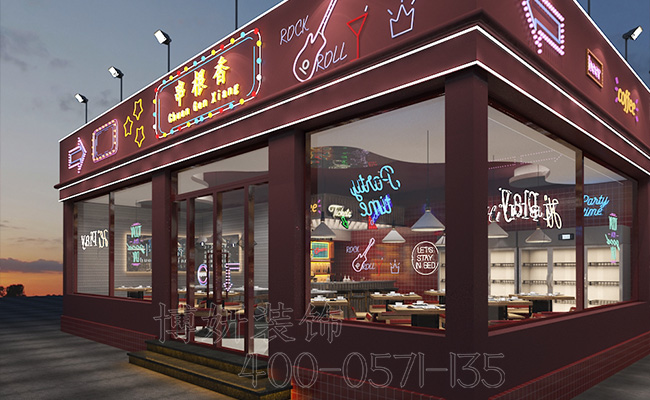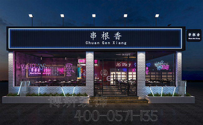 这是串串店面的门头装修设计,整体看上去就富有创意特色,采用深色系的大面积铺垫,内部加上五彩的霓虹灯,非常动感,更符合时代感。