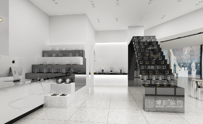 这是一家奢侈品店装修设计效果图。整体采用简约大气的装修手法,使顾客感觉到店铺的贵气。收银台装修设计的非常精美,白色系的大理石纹,桌面上使用黑色的大理石,整体装修设计实用性也非常强。