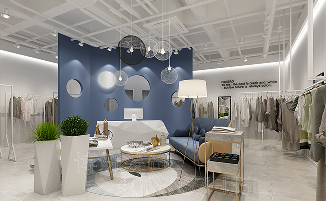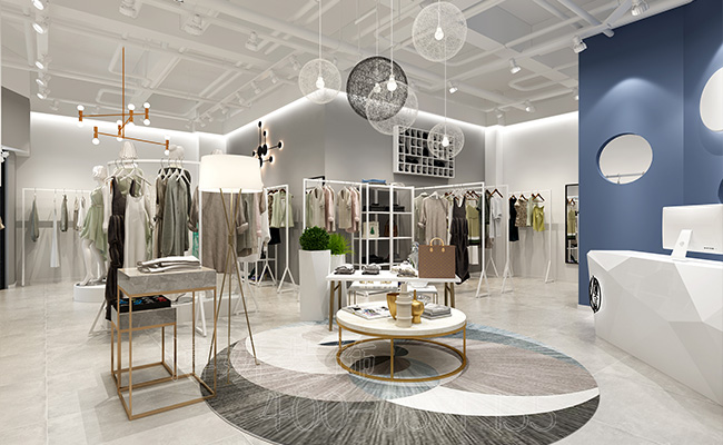 女装店内部的装修设计整体非常的简约,这边采用浅色系,顶部的吊灯作为装修中的一个亮点,创意十足。