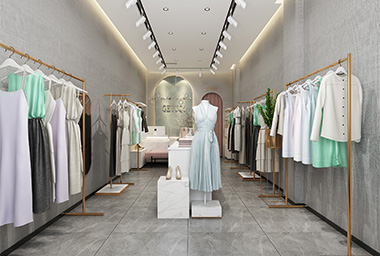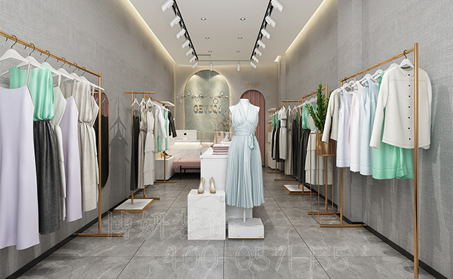 这是一家小面积女装店装修设计,整体店铺非常简约时尚。整体采用浅色系, 非常的清爽,可以将店面里的衣服很好的展现出来。上方的射灯可以将衣服更好的展现出来,无论是细节还是颜色。中间的摆放着展示台,漂亮的小饰品就可以精美的展现。
