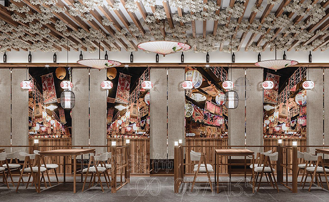 这是一家日料店装修设计效果图。日料店内采用很多的日系元素,餐厅顶部采用很多白色的樱花,中间挂着漂亮的花伞,意境十分漂亮。灯笼装饰也非常的独特,上面带有日式元素的装饰样式,从细节都体现的方方面面。